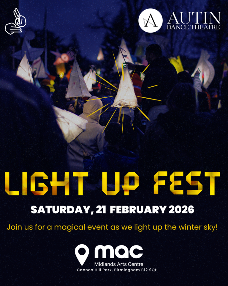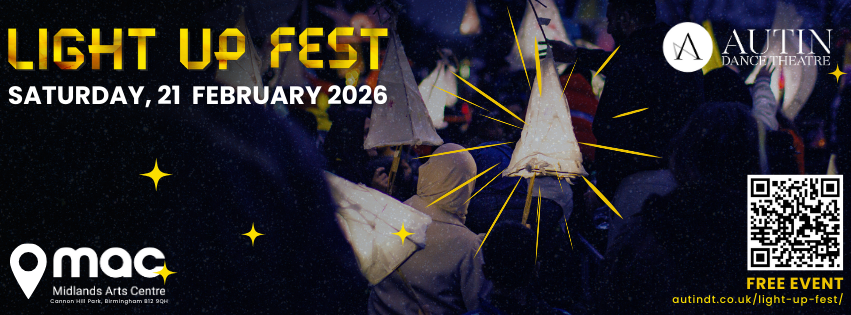 Light Up Fest is a vibrant, community-driven celebration by Autin Dance Theatre in partnership with Midlands Arts Centre (MAC), featuring awe-inspiring performances, interactive installations, and large-scale processions. Bringing light, movement, and creativity to public spaces, the festival invites audiences to explore themes of connection, resilience, and hope. Light Up Fest is where art meets community, transforming ordinary spaces into extraordinary experiences.